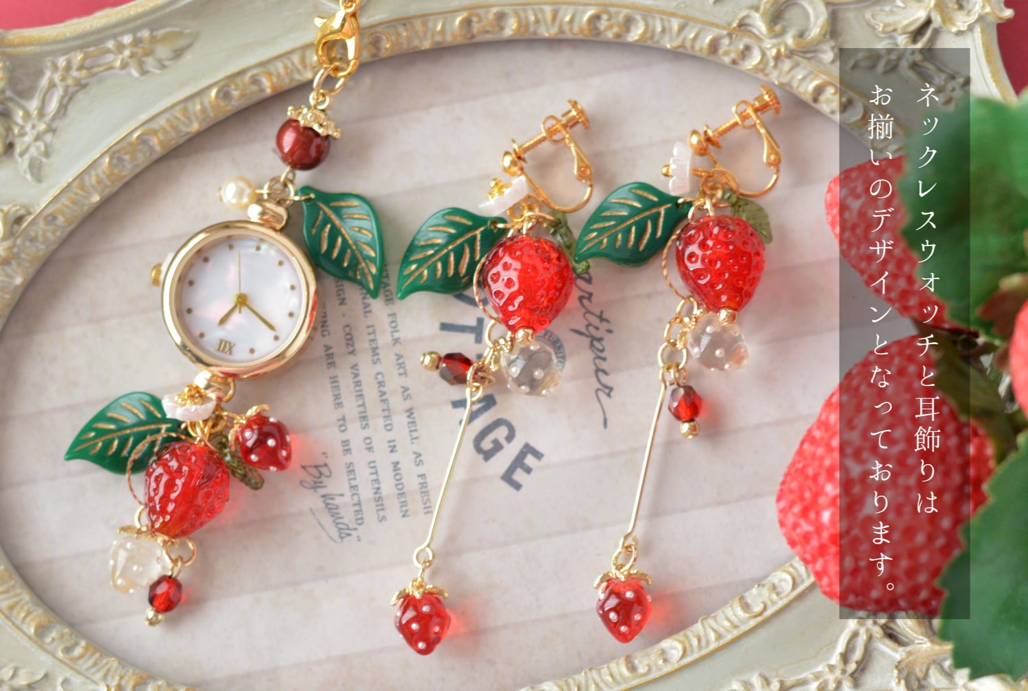 苺ビーズはガラス製ですがその他をアクリル製にして見た目より軽くなっております。